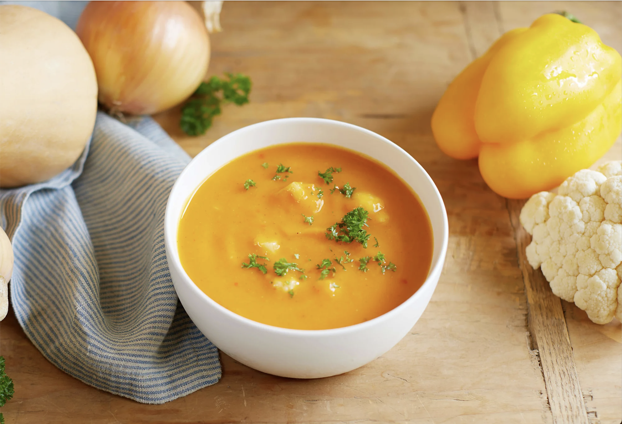 Una base suave y completa, tiernas flores de coliflor y un toque de alcaravea crean una sopa de calabaza verdaderamente reconfortante.