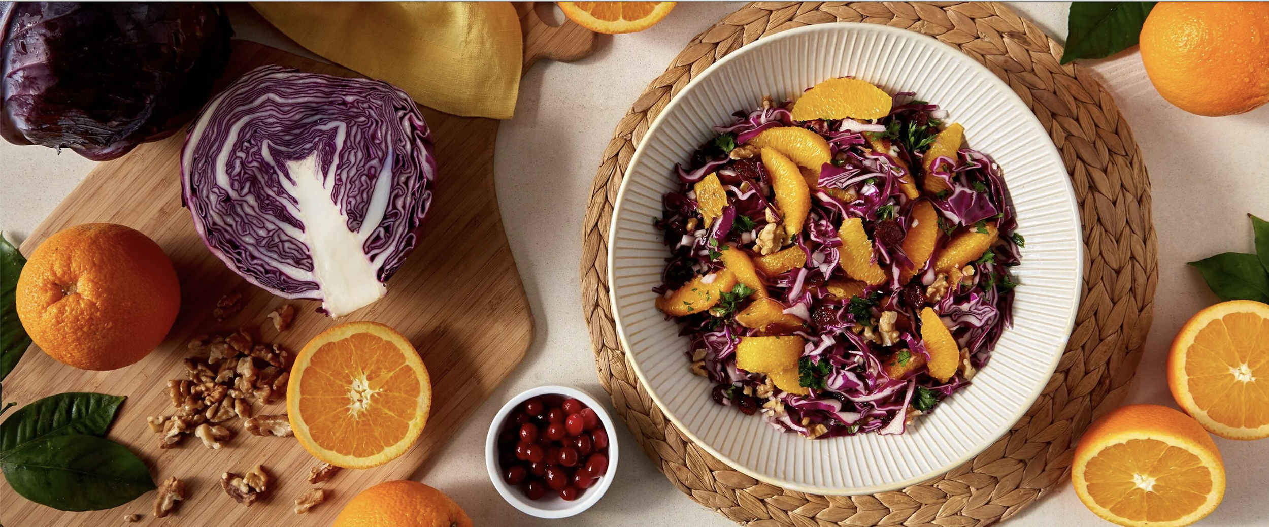 Ensalada de repollo morado con naranja, arándanos y nueces